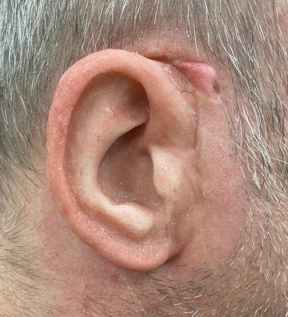 Das Basismaterial für die epithetische Versorgung ist medizinisches Silikon, das aber nicht in den Körper eingebracht, sondern nur auf die Haut aufgesetzt wird. Wir nehmen deshalb Silikon, weil dieses Material angenehm weich ist und geformt, wie ein natürliches Ohr erscheint. Es nimmt schnell die Körperwärme an und vermittelt am wenigsten das Gefühl eines Fremdkörpers. Während der Gestaltung der Epithese orientieren wir uns am verbliebenen Restohr oder spiegelbildlich am noch vorhandenen Ohr.